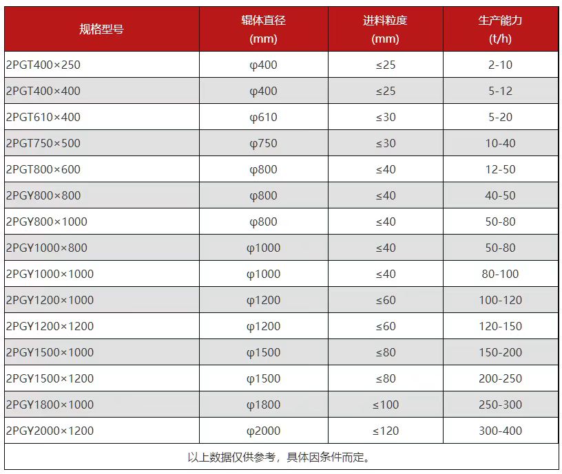 面對(duì)如此優(yōu)勢(shì)的碳素對(duì)輥破碎機(jī),很多客戶(hù)想到的是購(gòu)買(mǎi),那么在購(gòu)買(mǎi)之前,對(duì)輥破碎機(jī)都有哪些型號(hào),規(guī)格參數(shù)、生產(chǎn)能力又有什么區(qū)別: